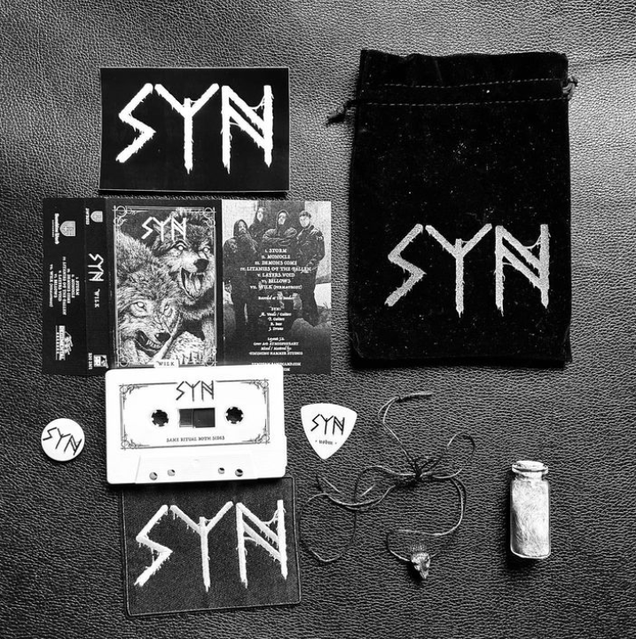 This release also comes in a DIE HARD EDITION, featuring the cassette tape inside a custom SYN emblazoned velvet bag, also with a pin, SYN guitar pick, embroidered patch, decal, and wolf pendant. PLUS a glass vile full of real wolf's fur.